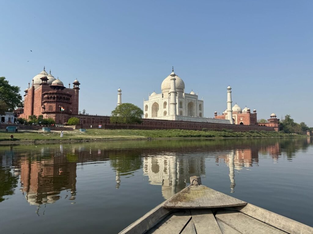 Sunset depuis Yamuna River 🌅 : Une balade en bateau au coucher du soleil donne des vues incroyables sur le Taj Mahal.