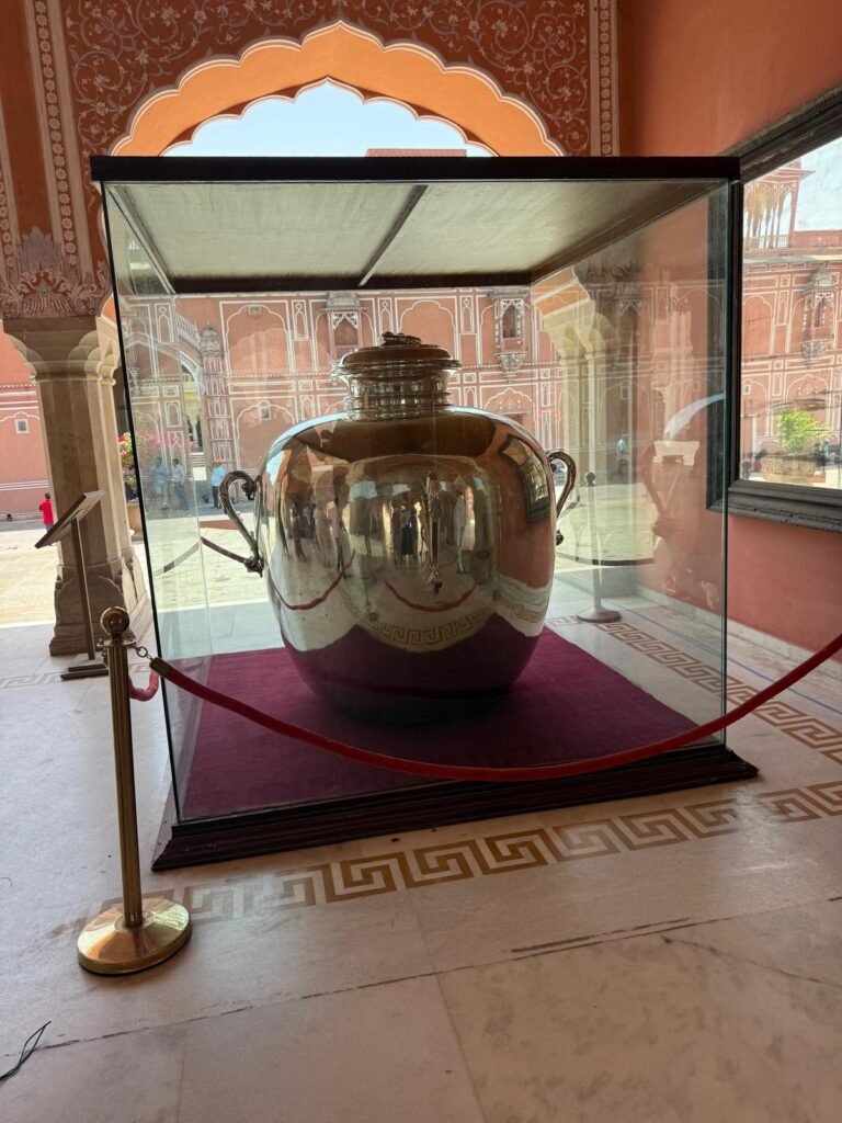 - City Palace 👑++ : Un superbe complexe royal avec des musées et des salles somptueuses. Ne manque pas la cour avec les portes colorées représentant les saisons ! Le City Palace abrite deux gigantesques jarres d’argent, considérées comme les plus grandes au monde. Le maharaja Sawai Madho Singh II les fit fabriquer pour transporter de l’eau du Gange lors de son voyage en Angleterre en 1902, car il refusait de boire une eau « impure » à l’étranger. Chaque jarre pèse plus de 340 kg et peut contenir 4 000 litres. Elles sont exposées aujourd’hui dans le palais comme symbole de foi et d’identité culturelle. Cette anecdote illustre le profond attachement des maharajas aux traditions hindoues, même en terre étrangère.