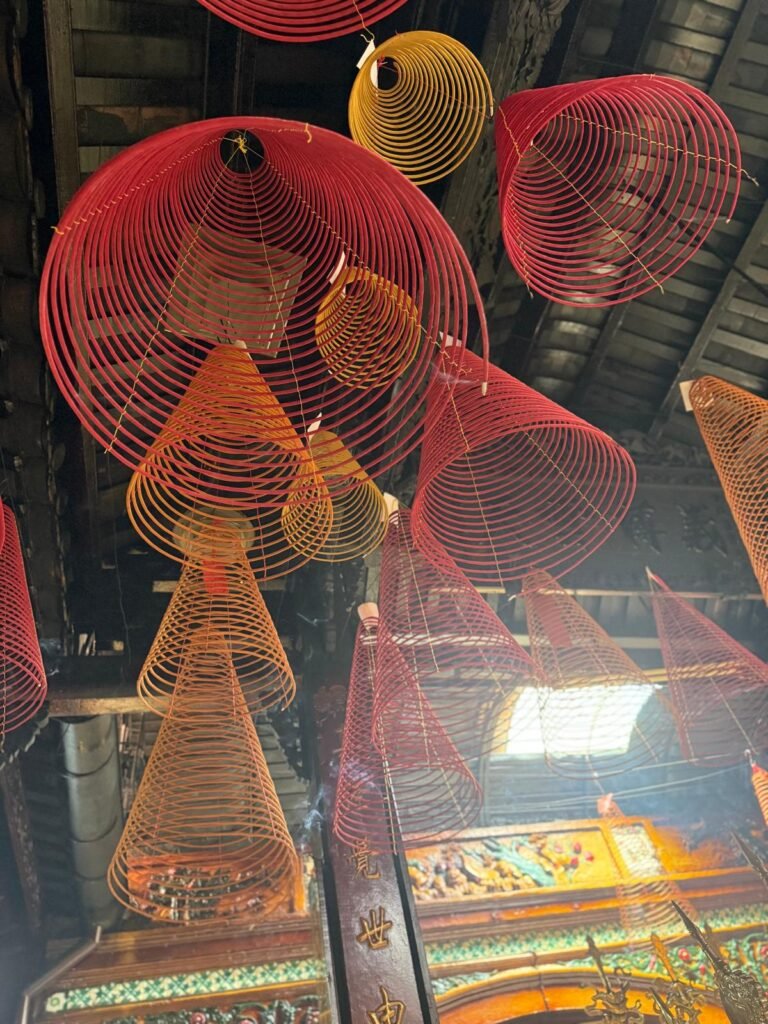 Cette journée commence à Cholon, le quartier chinois de Saïgon. Prenez un taxi Grab pour y aller. On visite deux temples majestueux, aux senteurs d’encens et à l’architecture chargée : le temple Phuoc An Hoi Quan (impressionnant) et le temple Quan Am (plus paisible, mais tout aussi beau).