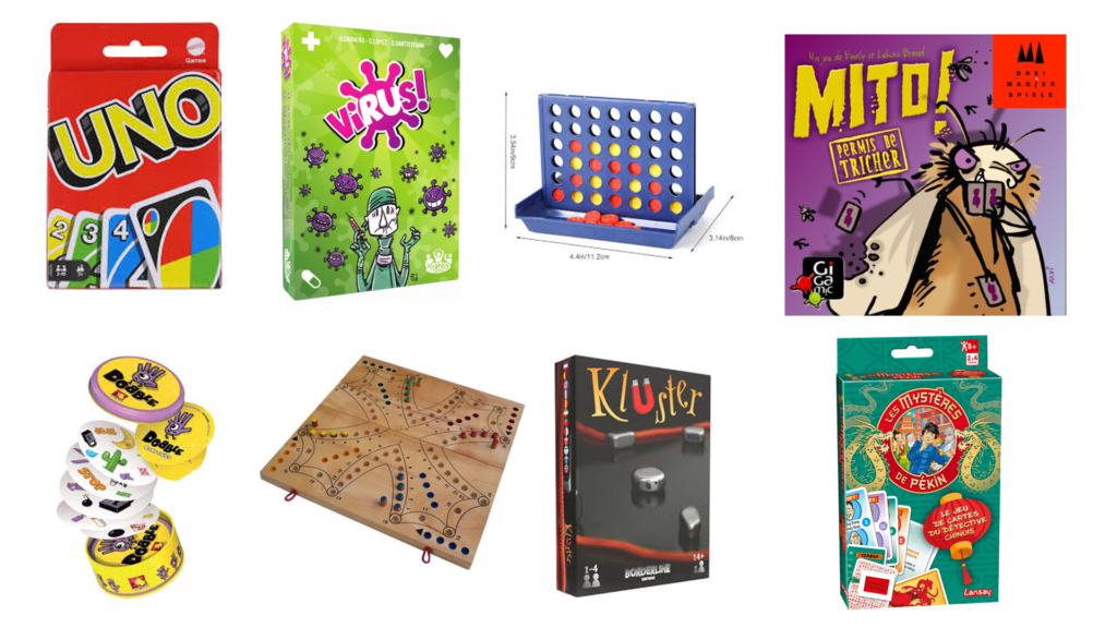 Exemples de jeux de société: Uno, Virus, Puissance 4, Mito, Dobble, Jeu en bois pliable Toc Toc, Kluster jeu d’aimants, les Mystères de Pékin