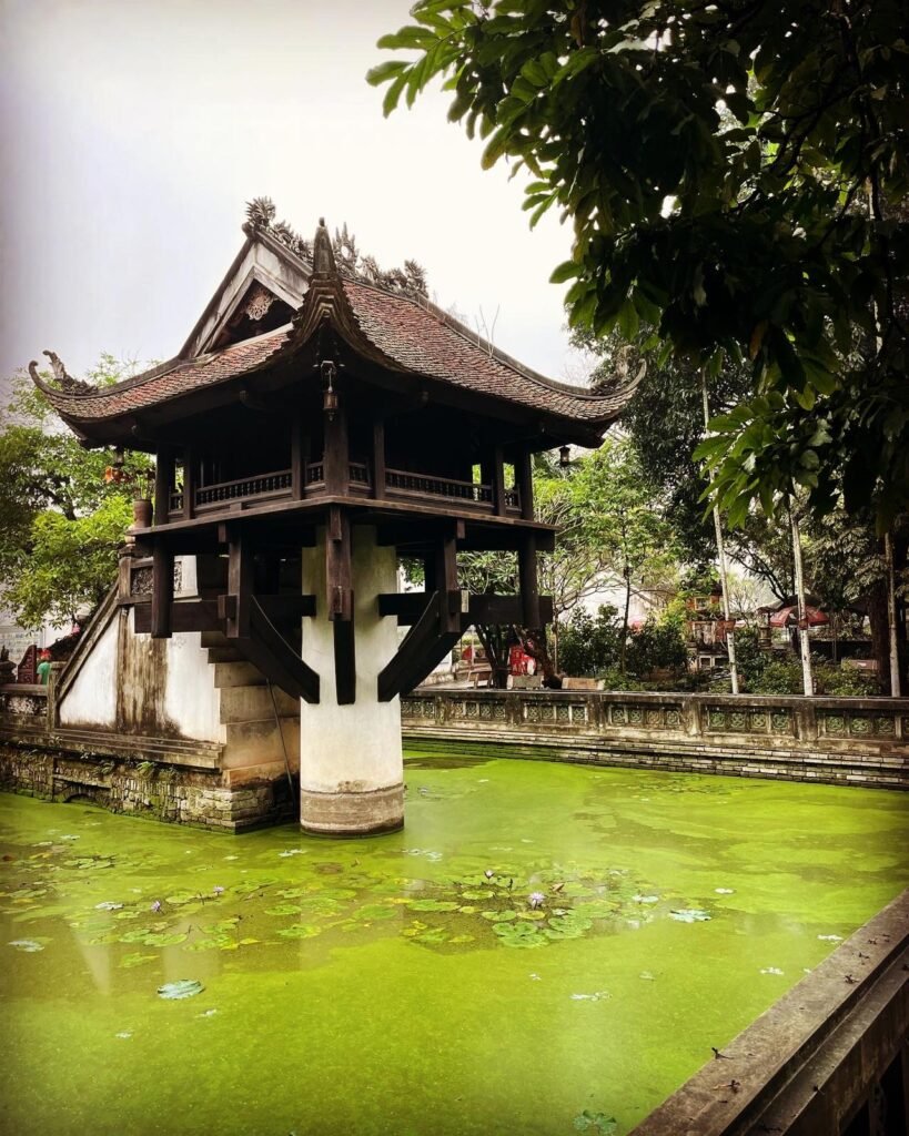 La pagode à pilier unique (Chùa Một Cột) : Visitez cette pagode emblématique, construite sur un unique pilier en bois, qui est un symbole important de Hanoï. Sa structure unique en bois repose sur un seul pilier, imitant la forme d’une fleur de lotus. Considéré comme un symbole de la ville, il est dédié à la déesse de la miséricorde, Quan Âm.