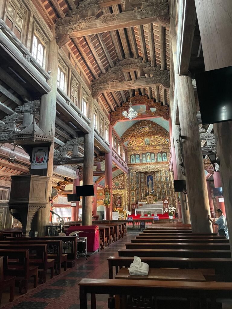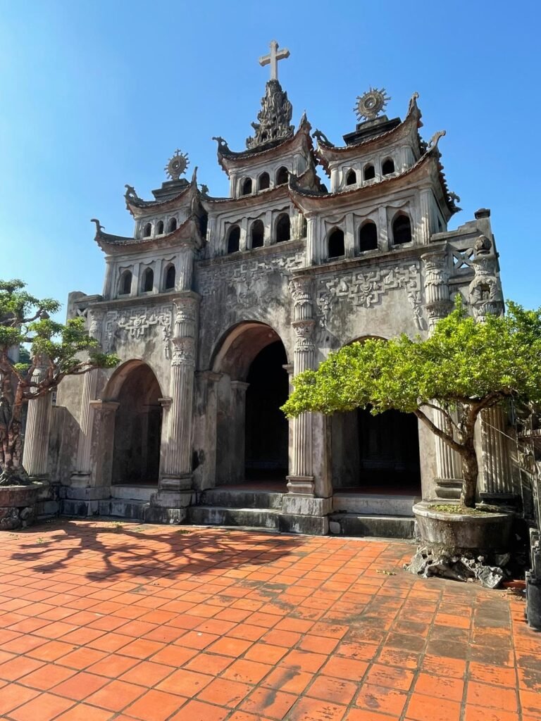 • Cathédrale de Phat Diem: La cathédrale de Phat Diem est un exemple remarquable d’architecture qui allie styles traditionnels vietnamiens et européens. Construite entre 1875 et 1899, elle a été conçue par le prêtre Nguyen Khac Tien. Le complexe comprend plusieurs structures, dont des pagodes et des statues, entourées de paysages pittoresques. C’est un lieu de culte important pour la communauté catholique locale, accueillant régulièrement des célébrations religieuses. 95% des 15000 villageois sont catholiques (70% des vietnamiens sont bouddhistes).
